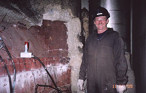 Yep , this is one of those places we talked about earlier . Maybe not the most comfortable place to be , but this is where the action is . Dust mask is not an option , but is an essential piece of equipment as is the large hammer wrench in the hand of Attila Tiffan . Judging by the smile , I'd say Attila is destined to be a Pro ... once he finishes